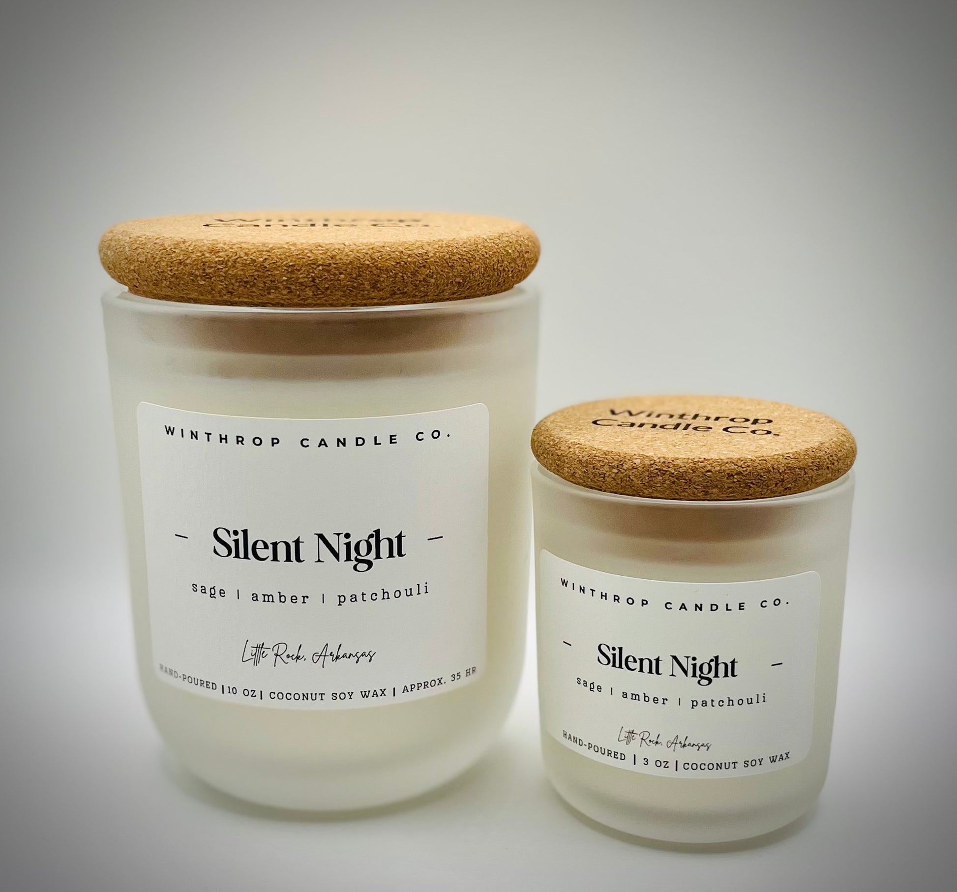 From our Seasonal Collection, Silent Night captures the stillness and sparkle of a peaceful winter evening. Hand-poured in a 10oz frosted glass vessel with coconut soy wax and a cotton wick, it glows softly beneath a natural cork lid, evoking the quiet beauty of candlelight in snow-dusted glass.